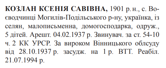 Реабілітована: Вінницькою облпрокуратурою 21.07.1994 Реабілітовані історією