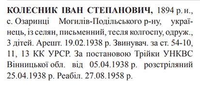 Іван Колесник розстріляний 25.04.1938 р.