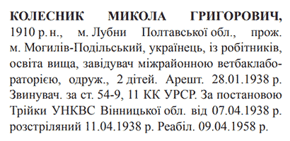 Микола Колесник розстріляний 11.04.1938 р.