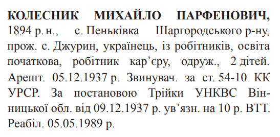 54-10 КК УССР. Трійкою УНКВС Вінницької обл. засуджений до 10 років ВТТ