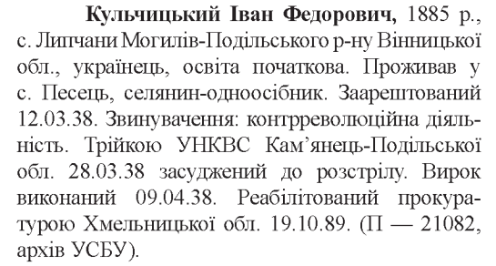 Соціальне походження: н/дОсвіта: початковаПрофесія (місце роботи): одноосібникЗаарештований: 12.03.1938Звинувачення: "контрреволюційна діяльність"Трійкою УНКВД Кам'янець-Подільської обл. засуджений до розстрілуДата вироку: 28.03.1938Іван Кульчицький розстріляний 09.04.1938 р.Реабілітований: Прокуратурою Хмельницької обл. 19.10.1989
