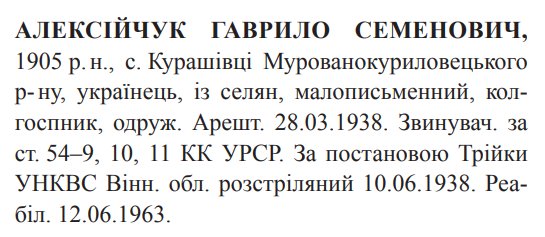 Гаврило Алексійчук розстріляний 10.06.1938.