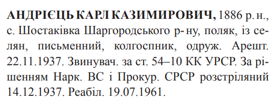 Соціальне походження: із селянОсвіта: письменнийПартійність: н/дПрофесія (місце роботи): колгоспникСімейний стан: одруженийЗаарештований: 22.11.1937Звинувачення: ст. 54-10 КК УССРНаркомом ВС і Прокурором СССР засуджений до розстрілуДата вироку: 09.12.1937 (протокол № 497)Кароль Андрієць розстріляний 15.12.1937 р. в м. Вінниця.Реабілітований: 19.07.1961