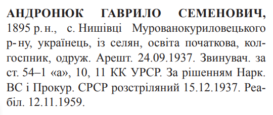 Гаврило Андронюк розстріляний 15.12.1937.