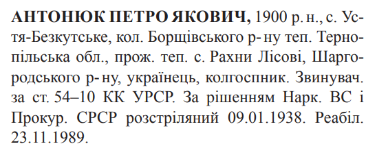 Петро Антонюк розстріляний 09.01.1938 у м. Вінниця.
