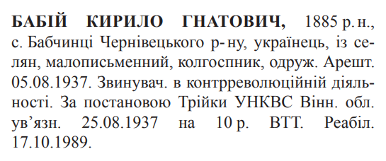 Реабілітований: Вiнницьким облпрокурором 17.10.1989 Реабілітовані історією