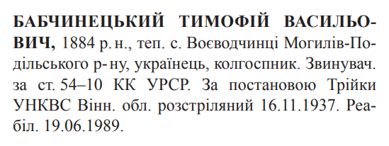 Тимофій Бабчинецький розстріляний 16.11.1937.