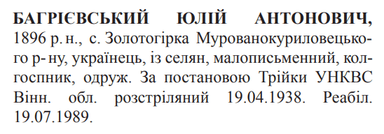 Реабілітований: Вiнницьким облпрокурором 19.07.1989 Реабілітовані історією