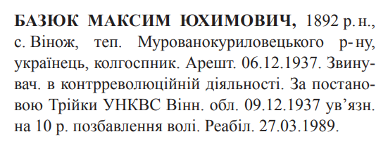 Реабілітований: Вiнницькою облпрокуратурою 27.03.1989 Реабілітовані історією
