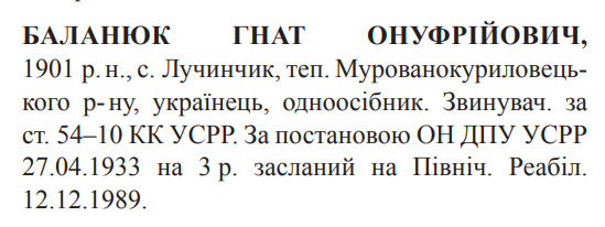 Реабілітований: Вiнн.облпрокуратурою 12.12.1989 Реабілітовані історією
