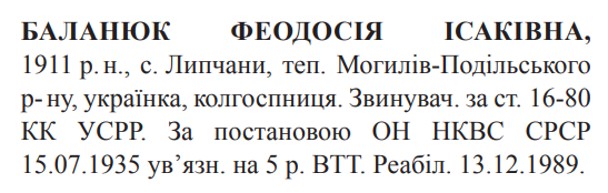 Реабілітована: Вiнницькою облпрокуратурою 13.12.1989 Реабілітовані історією