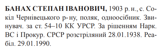 Соціальне походження: н/дОсвіта: н/дПартійність: н/дПрофесія (місце роботи): одноосiбникСімейний стан: н/дЗаарештований: н/дЗвинувачення: ст. 54-10 КК УССРНаркомом ВС і Прокурором СССР засуджений до розстрілуДата вироку: 03.01.1938 (протокол № 694)Степан Банах розстріляний 28.01.1938 р. в м. Могилів-Подільський.Реабілітований: Вiнницькою облпрокуратурою 29.01.1990