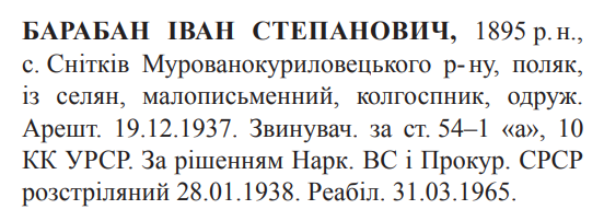 Іван Барабан розстріляний 28.01.1938.