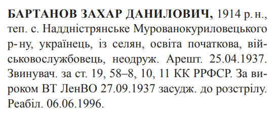 Захар Бартанов розстріляний 05.01.1938 р. в м. Ленінград.