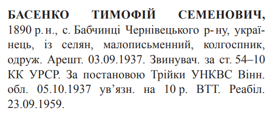 Реабілітований: Вінницьким облсудом 23.09.1959 Реабілітовані історією