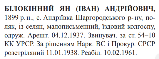 Ян (Іван) Білокінний розстріляний 11.01.1938.