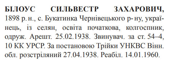 Сильвестр Білоус розстріляний 27.04.1938.
