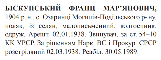 Франц Біскупський розстріляний 02.03.1938.