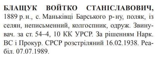 Соціальне походження: із селянОсвіта: неписьменнийПартійність: н/дПрофесія (місце роботи): колгоспникСімейний стан: одруженийЗаарештований: н/дЗвинувачення: ст. 54-4, 54-10 КК УССРНаркомом ВС і Прокурором СССР засуджений до розстрілуДата вироку: 03.02.1938Войтко Блащук розстріляний у Вінниці 17.02.1938 р.Реабілітований: Вінницьким облпрокуррором 07.07.1989