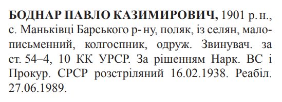 Соціальне походження: із селянОсвіта: малописьменнийПартійність: н/дПрофесія (місце роботи): колгоспникСімейний стан: одруженийЗаарештований: н/дЗвинувачення: ст. 54-4, 54-10 КК УССРНаркомом ВС і Прокурором СССР засуджений до розстрілуДата вироку: 03.02.1938Павло Боднар розстріляний у Вінниці 17.02.1938 р.Реабілітований: Вiнницьким облпрокурором 27.06.1989