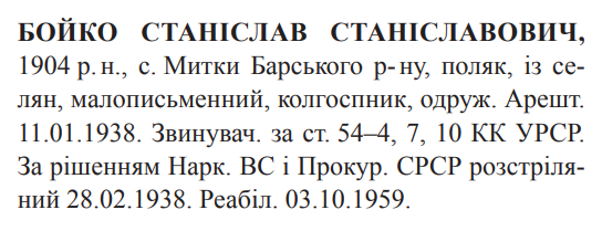 Соціальне походження: із селянОсвіта: малописьменнийПартійність: н/дПрофесія (місце роботи): колгоспникСімейний стан: одружений, троє дітейЗаарештований: 11.01.1938Звинувачення: ст. 54-4, 54-7, 54-10 КК УССРНаркомом ВС і Прокурором СССР засуджений до розстрілуДата вироку: 09.02.1938Станіслав Бойко розстріляний 28.02.1938 в м. Вінниця.Реабілітований: Верховним судом УССР 03.10.1959