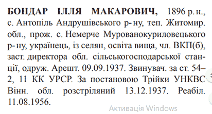 Реабілітований: Вiнницьким облсудом 11.08.1956 Реабілітовані історією