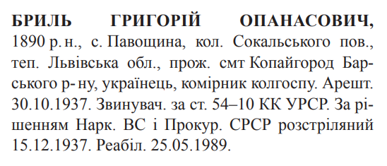 Соціальне походження: н/дОсвіта: н/дПартійність: н/дПрофесія (місце роботи): комірник колгоспуСімейний стан: н/дЗаарештований: 30.10.1937Звинувачення: ст. 54-10 КК УССРНаркомом ВС і Прокурором СССР засуджений до розстрілуДата вироку: 01.12.1937Григорій Бриль розстріляний 15.12.1937 р. в м. Могилів-ПодільськийРеабілітований: Вiнницькою облпрокуратурою 25.05.1989