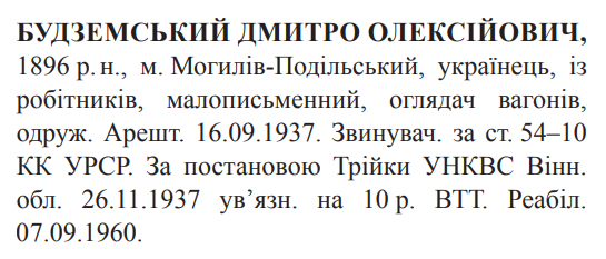 Реабілітований: Вiнницьким облсудом 07.09.1960 Реабілітовані історією