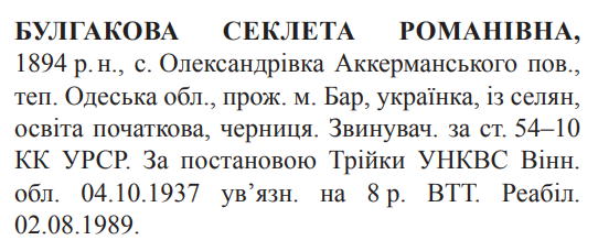 Реабілітована: Вінницькою облпрокуратурою 02.08.1989 Реабілітовані історією