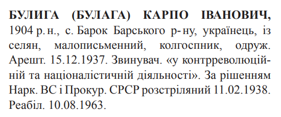 Соціальне походження: із селянОсвіта: малописьменнийПартійність: н/дПрофесія (місце роботи): колгоспникСімейний стан: одружений, 1 синЗаарештований: 15.12.1937Звинувачення: "контрреволюційна та націоналістична діяльність"Наркомом ВС і Прокурором СССР засуджений до розстрілуДата вироку: 16.01.1938Карпо Булега розстріляний 12.02.1938 р. в м. ВінницяРеабілітований: Верховним Судом УССР 10.08.1963 р.