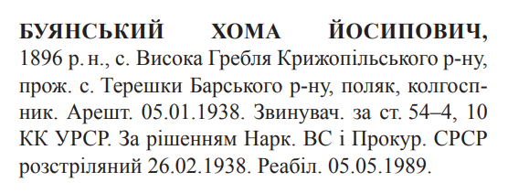 Хома Буянський розстріляний 26.02.1938.