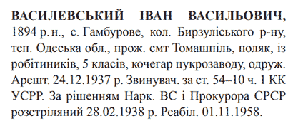 Іван Василевський розстріляний 28.02.1938 в м. Вінниця.