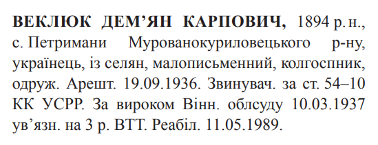 Реабілітований: Верховним судом УССР 11.05.1989 Реабілітовані історією