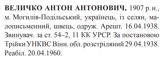 Антон Величко розстріляний 29.04.1938.