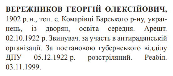 Георгій Вережников розстріляний 05.12.1922.