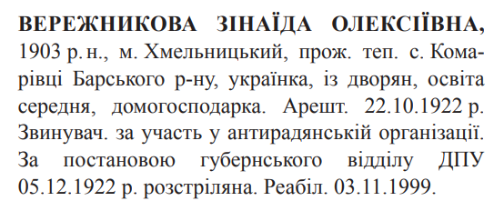 Зінаїда Вережникова розстріляна 05.12.1922.