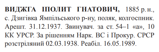 Соціальне походження: н/дОсвіта: н/дПартійність: н/дПрофесія (місце роботи): колгоспникСімейний стан: н/дЗаарештований: 31.12.1937Звинувачення: ст. 54-1 "а", 54-10 КК УССРНаркомом ВС і Прокурором СССР засуджений до розстрілуДата вироку: 03.02.1938Іполит Виджга розстріляний 03.03.1938 р. в м. ВінницяРеабілітований: Вінницькою облпрокуратурою 16.05.1989