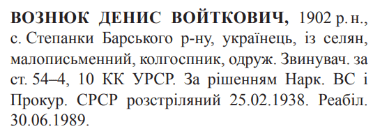Соціальне походження: із селянОсвіта: малописьменнийПартійність: н/дПрофесія (місце роботи): колгоспникСімейний стан: одружений, одна дитинаЗаарештований: н/дЗвинувачення: ст. 54-4, 54-10 КК УССРНаркомом ВС і Прокурором СССР засуджений до розстрілуДата вироку: 08.02.1938 (протокол № 919)Денис Вознюк розстріляний 26.02.1938 р. в м. Вінниця.Реабілітований: Вінницьким облпрокурором 30.06.1989 р.