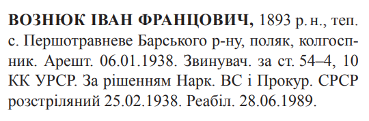 Соціальне походження: н/дОсвіта: н/дПартійність: н/дПрофесія (місце роботи): колгоспникСімейний стан: н/дЗаарештований: 06.01.1938Звинувачення: ст. 54-4, 54-10 КК УССРНаркомом ВС і Прокурором СССР засуджений до розстрілуДата вироку: 08.02.1938 (протокол № 919)Іван Вознюк розстріляний 26.02.1938 р. в м. Вінниця.Реабілітований: Вінницькою облпрокуратурою 28.06.1989 р.