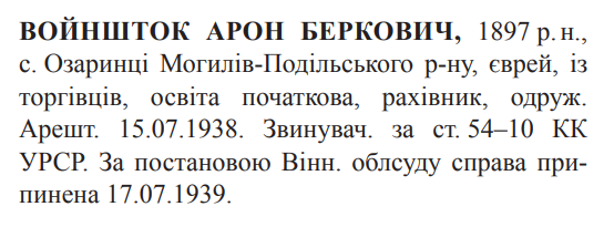Соціальне походження: з торговцівОсвіта: початковаПартійність: н/дПрофесія (місце роботи): рахівник колгоспуСімейний стан: одружений, троє дітейЗаарештований: 15.07.1938Звинувачення: ст. 54-10 КК УССРВінницьким облсудом засуджений до 2,5 років ВТТДата вироку: 04.04.1939Реабілітований: 17.07.1959(Можливий варіант написання прізвища: Вайнштейн)