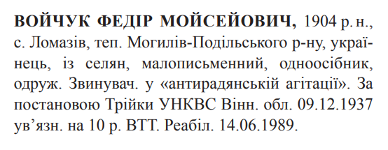 Реабілітований: Вінницьким облпрокурором 14.06.1989 Реабілітовані історією