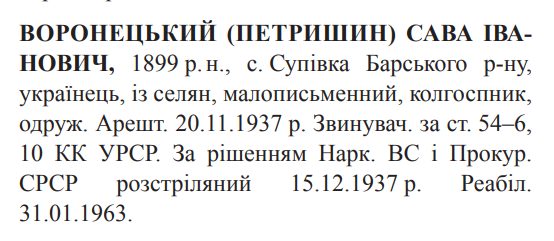 Сава Воронецький (Петришин) розстріляний 15.12.1937.