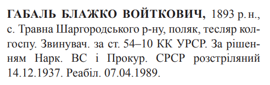 Соціальне походження: н/дОсвіта: н/дПартійність: н/дПрофесія (місце роботи): тесляр колгоспуСімейний стан: н/дЗаарештований: н/дЗвинувачення: ст. 54-10 КК УССРНаркомом ВС і Прокурором СССР засуджений до розстрілуДата вироку: 09.12.1937Блажко Габаль розстріляний 15.12.1937 р. в м. ВінницяРеабілітований: Вінницькою облпрокуратурою 07.04.1989