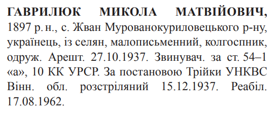 Микола Гаврилюк розстріляний 15.12.1937.
