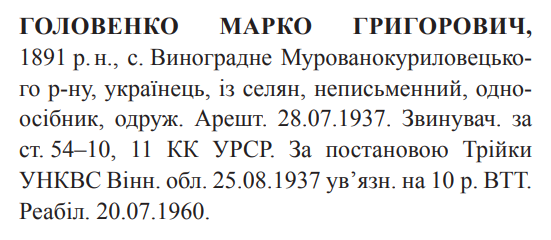 Реабілітований: Вінницьким облсудом 20.07.1960 Реабілітовані історією
