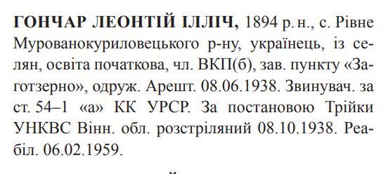 Леонтій Гончар розстріляний 08.10.1938.