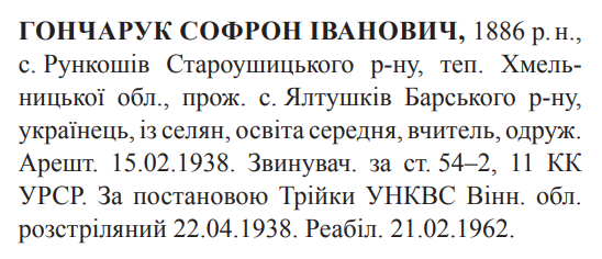 Софрон Гончарук розстріляний 22.04.1938.