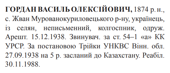 Реабілітований: Вінницьким облсудом 30.11.1988 Реабілітовані історією