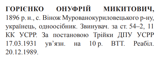 Соціальне походження: н/дОсвіта: н/дПартійність: н/дПрофесія (місце роботи): одноосiбникСімейний стан: н/дЗаарештований: 14.11.1930Звинувачення: ст. 54-2, 54-11 КК УССРТрійкою ГПУ УСРР засуджений до 10 років ВТТДата вироку: 17.03.1931Реабілітований: Вінницькою облпрокуратурою 20.12.1989