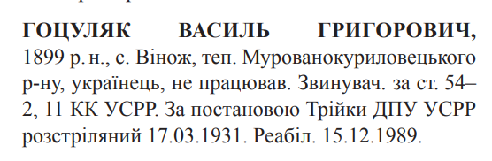 Василь Гоцуляк розстріляний 17.03.1931.